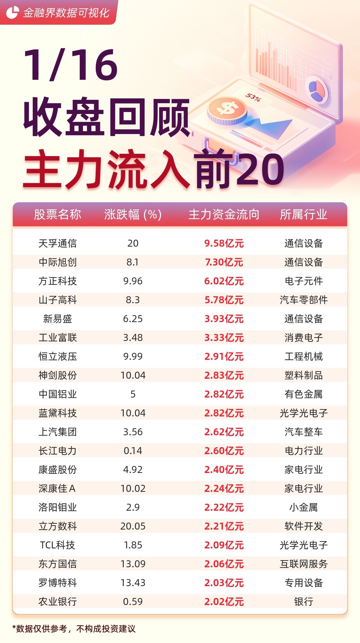 截至1月16日收盘回顾,主力资金流入前20的股票分别为:天孚通信(9.58亿元)、中际旭创(7.30亿元)、方正科技(6.02亿元)、山子高科(5.78亿元)、新易盛(3.93亿元)、工业富联(3.33亿元)、恒立液压(2.91亿元)、神剑股份(2.83亿元)、中国铝业(2.82亿元)、蓝黛科技(2.82亿元)、上汽集团(2.62亿元)、长江电力(2.60亿元)、康盛股份(2.40亿元)、深康佳A(2.24亿元)、洛阳钼业(2.22亿元)、立方数科(2.21亿元)、TCL科技(2.09亿元)、东方国信(2.06亿元)、罗博特科(2.03亿元)、农业银行(2.02亿元)。
